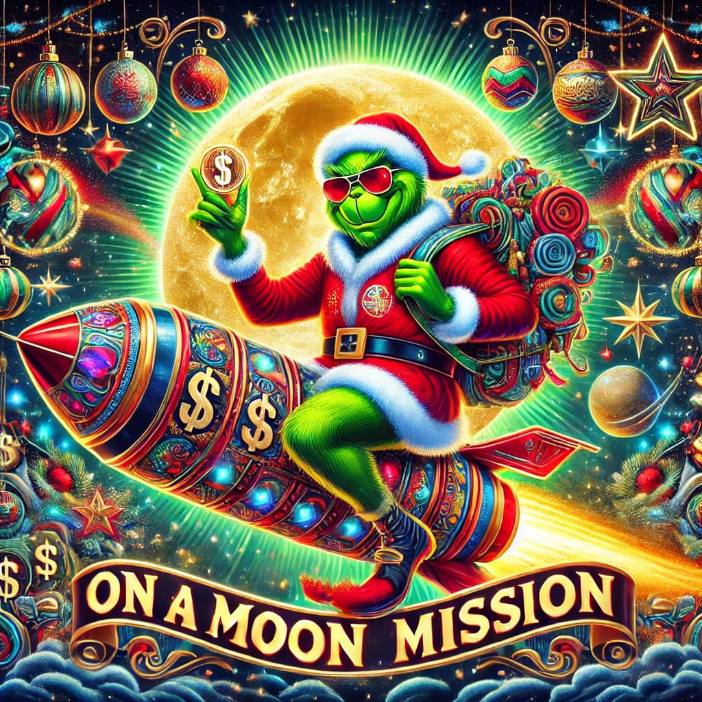 The Grinch swapped stealing Christmas for stealing the crypto spotlight. Riding a rocket labeled "$1Grinch," he soared past the stars, clutching a glowing $1 coin. "Who needs Whoville? I'm moon-bound!" he cackled, turning mischief into meme-worthy gains.