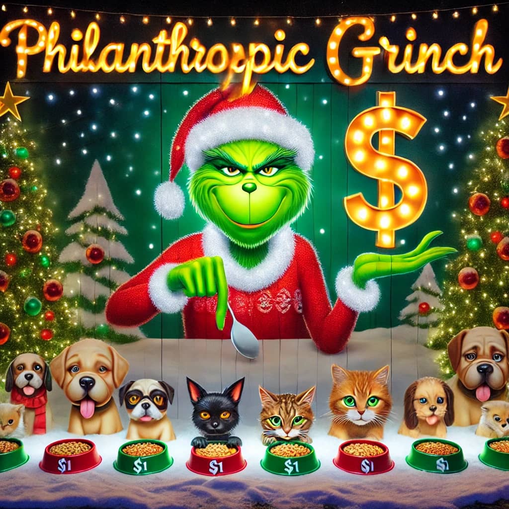 The $1Grinch, grumbling about fur and slobber, spent Christmas handing out treats to cats and dogs. "This isn’t for you—it's for my image," he muttered. But as tails wagged and purrs echoed, his heart betrayed him, growing three sizes once more..
